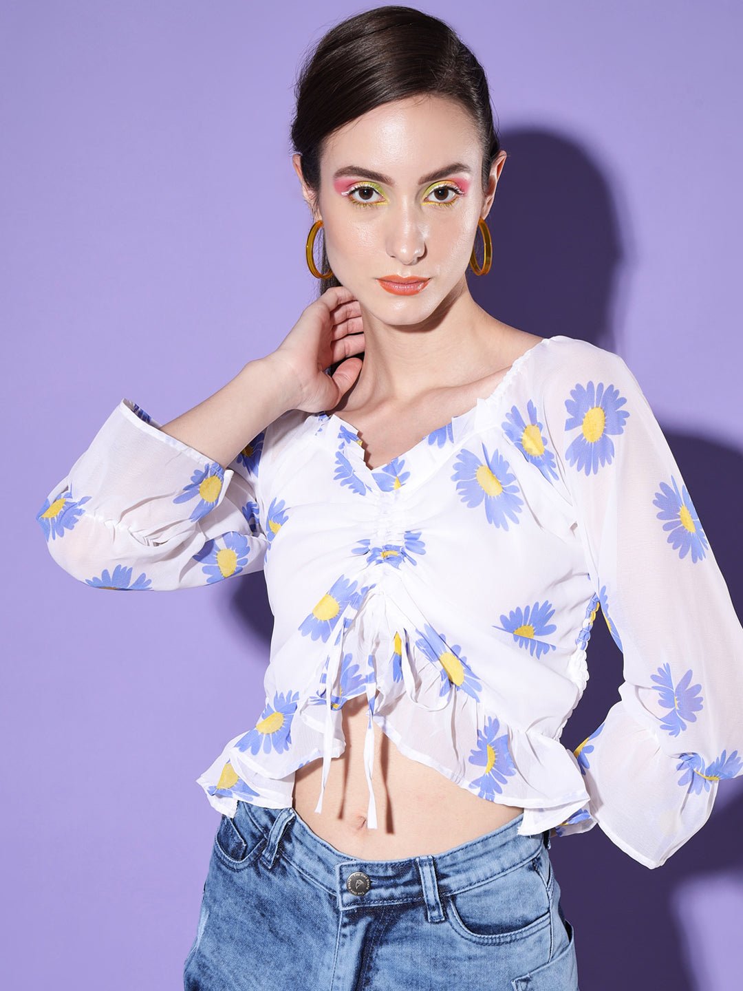 Flower print short crop top made of georgette fabric, v neck on front and square neck on back, rib in front to tie it and make your look more gorgeous, smocking on back side of top, 3/4th sleeves, elastic use on bottom of sleeves.